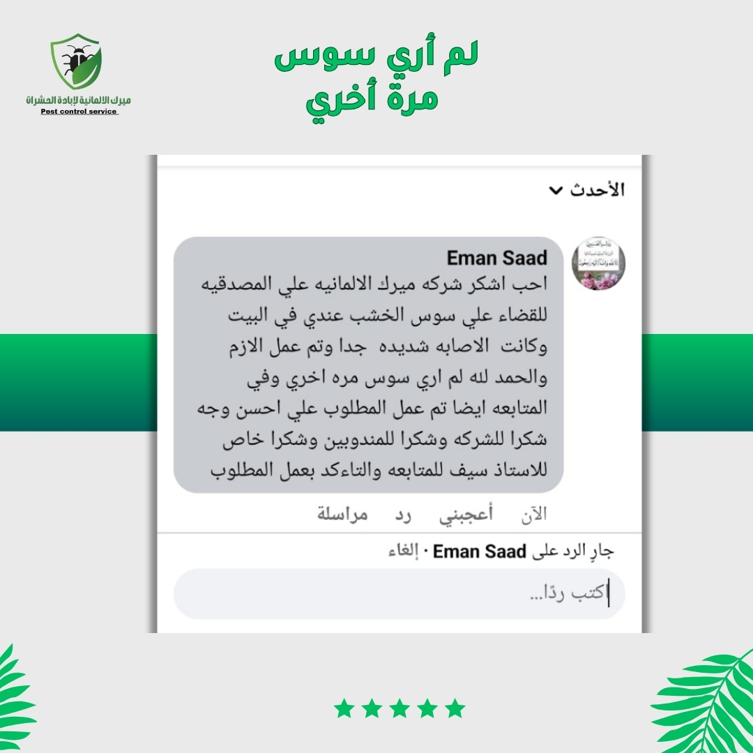 مع ميرك الألمانية هتتخلص من البق نهائيًا باستخدام أحدث التقنيات الآمنة والمعتمدة. بنوفرلك حماية كاملة لأسرتك ونضمنلك بيئة نظيفة خالية من الحشرات مع متابعة دورية عشان البق مايرجعش تاني