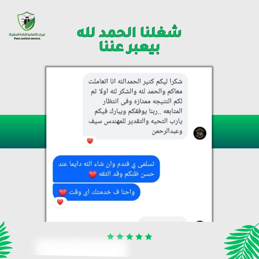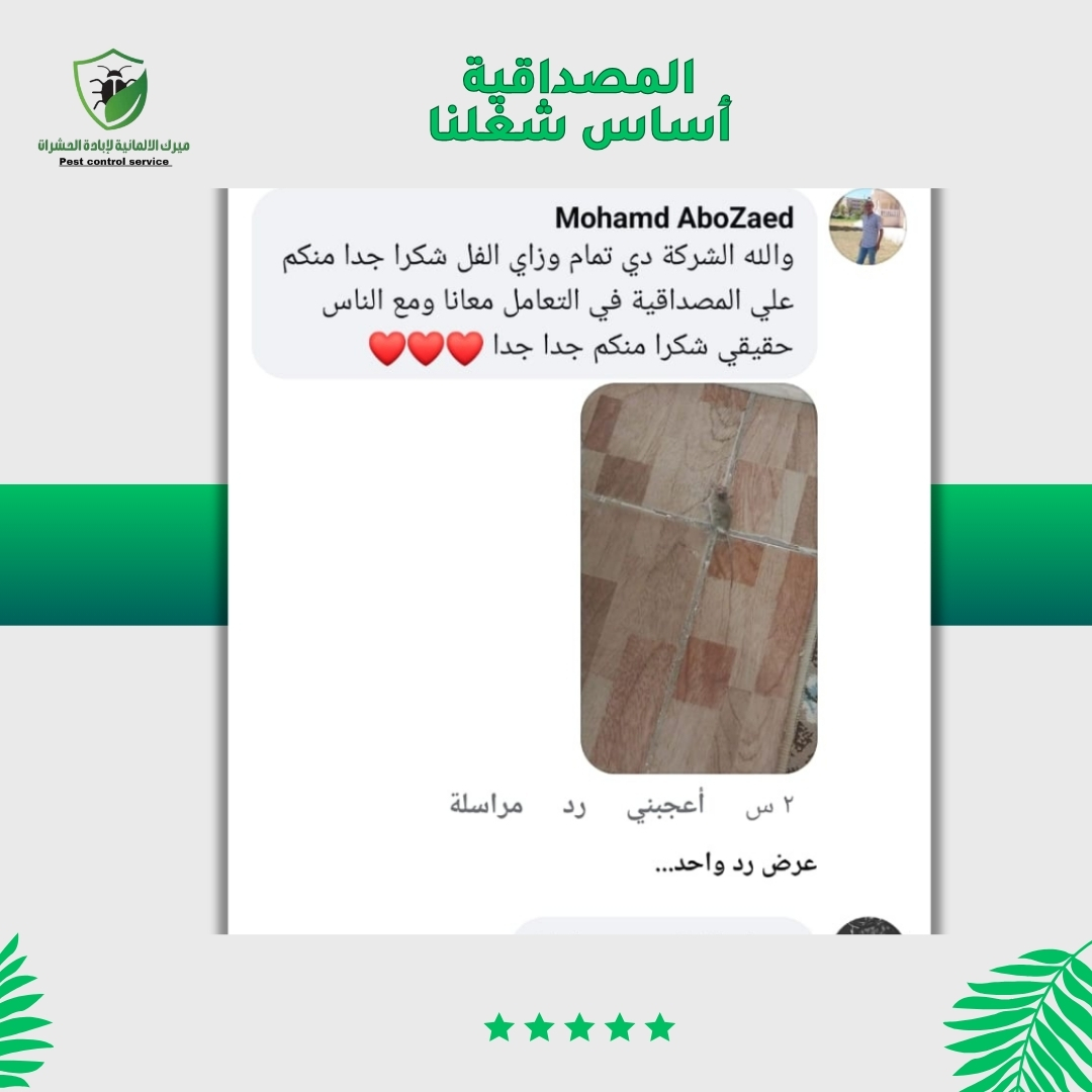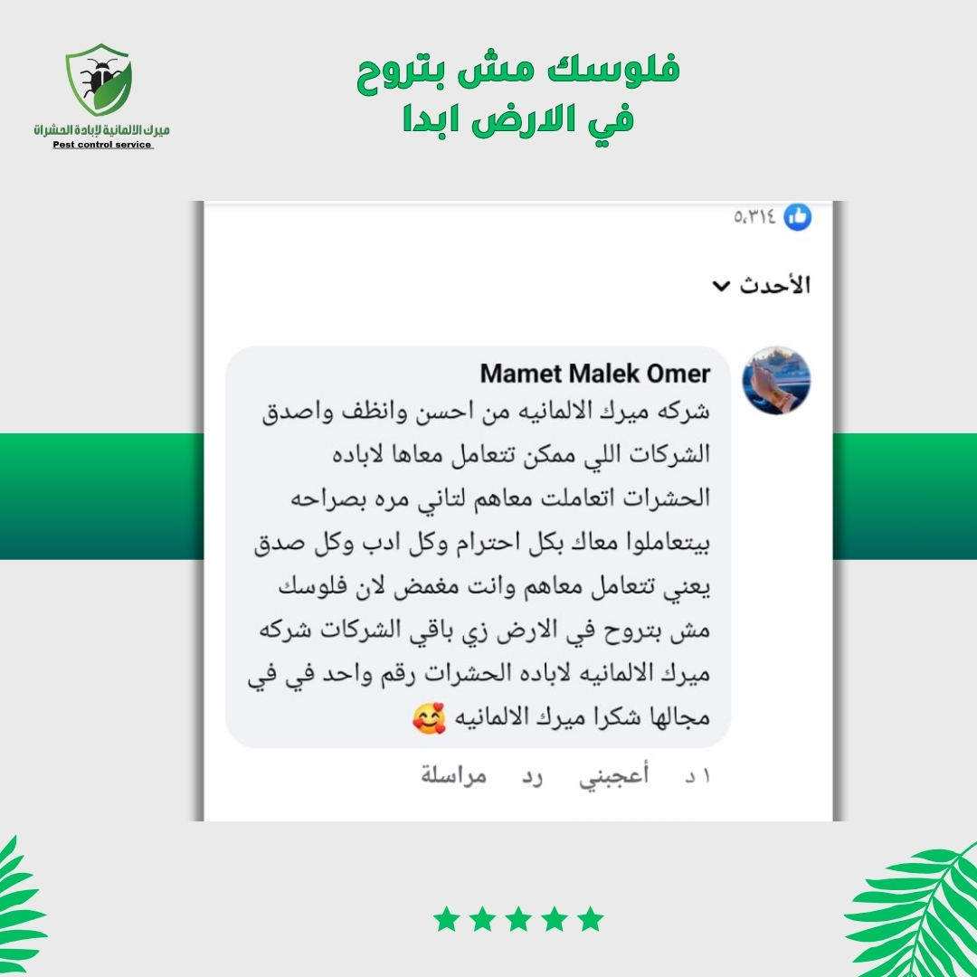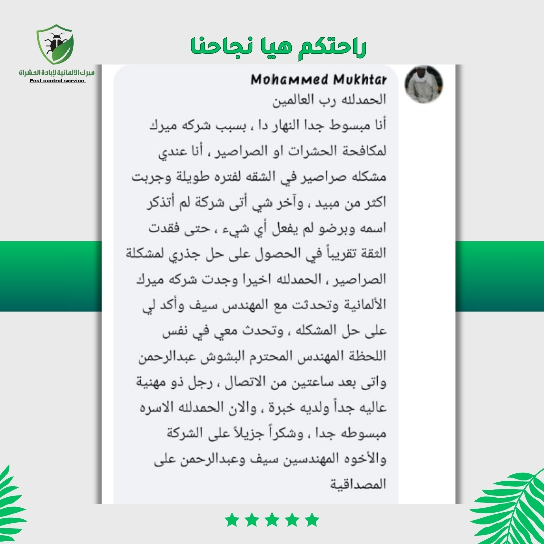 شركة ميرك الألمانية متخصصة في مكافحة جميع أنواع الحشرات باستخدام أحدث التقنيات والمواد الآمنة والصديقة للبيئة. نوفر لك حلول سريعة وفعّالة للتخلص من البق، الصراصير، النمل، الفئران وغيرها، مع ضمان 100% ونتائج تدوم طويلًا
